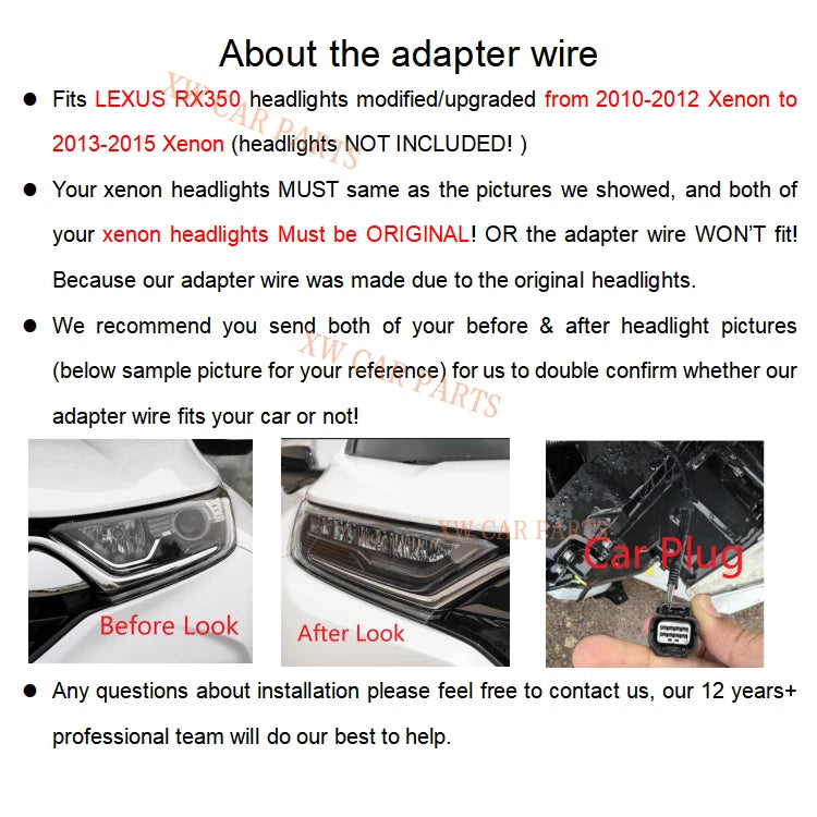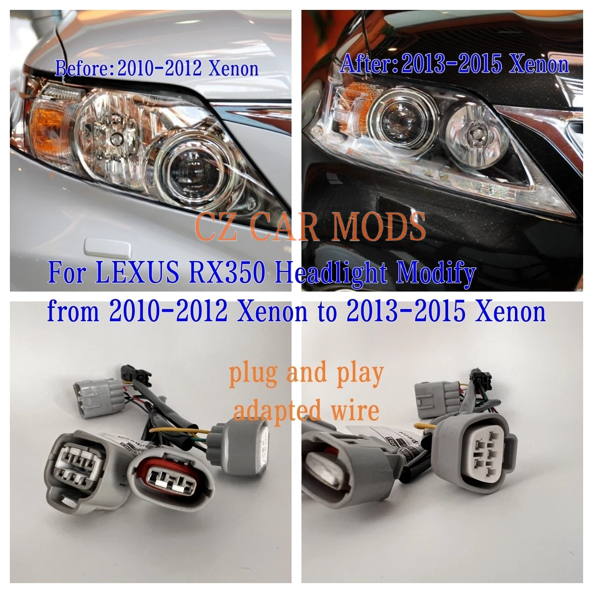 Adapter wire harness conversion kit fits 2010 2011 2012 LEXUS RX350 Xenon headlights modified to 2013 2014 2015 version xenon headlights, Plug and play. Headlights NOT INCLUDED!