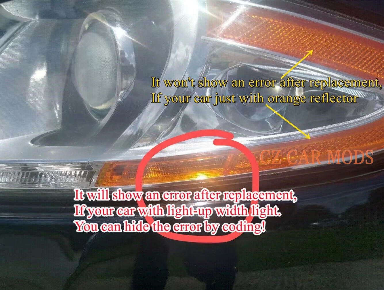 The USA version cars may show errors after modification because of the US version width light (which the China version doesn't have). If your US version headlights only come with an orange reflector, won't show errors.