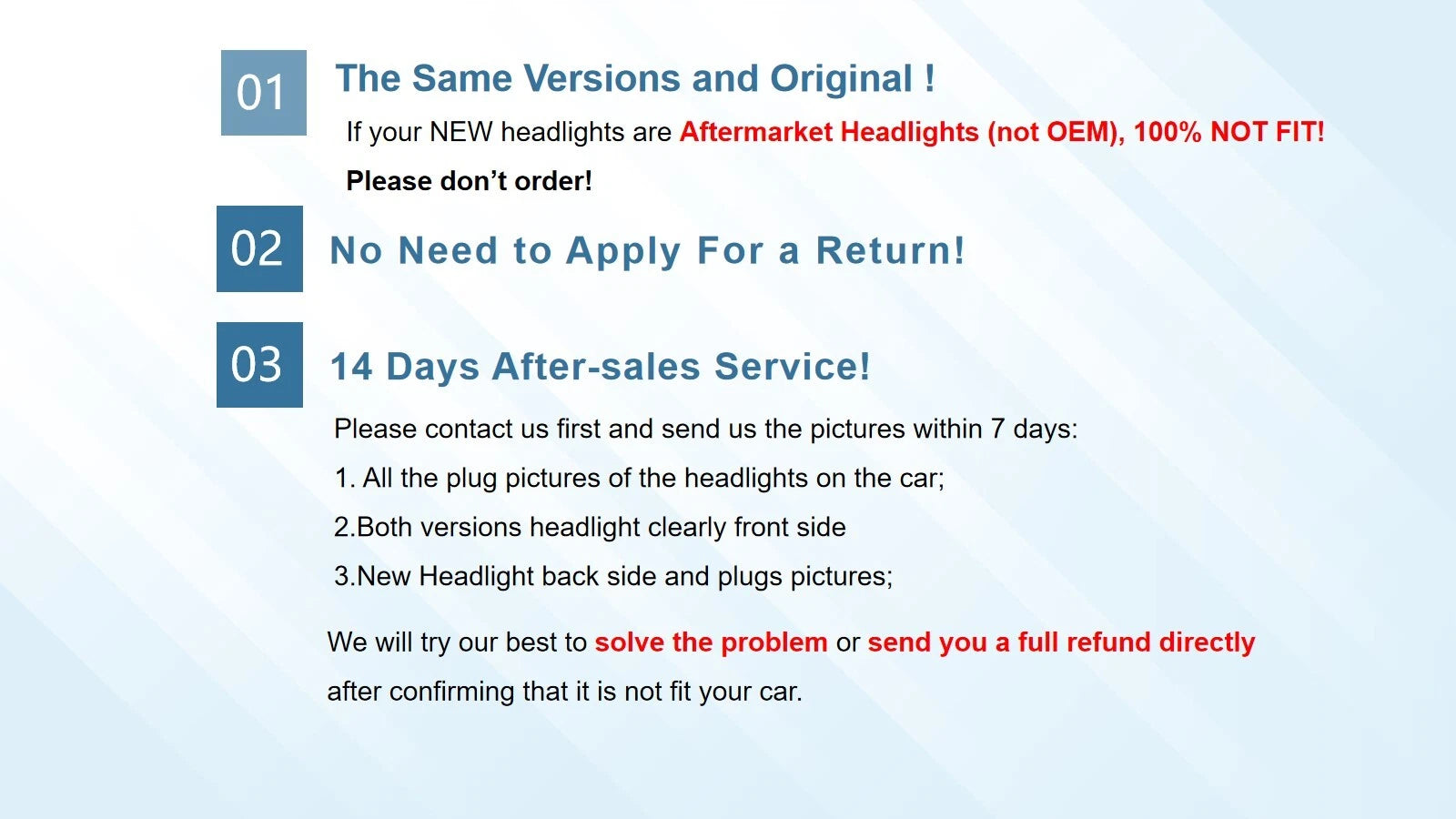 PLEASE CONFIRM ALL THE DETAILS (your before & after headlights) WITH US BEFORE PLACING AN ORDER. Thank you so much for your kindly understanding.