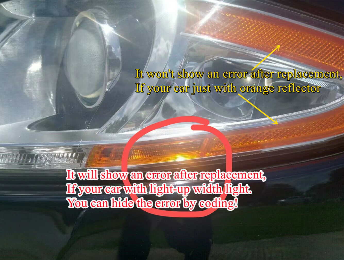 The USA version cars may show errors after modification because of the US version width light (which the China version doesn't have). If your US version headlights only come with an orange reflector, won't show errors.