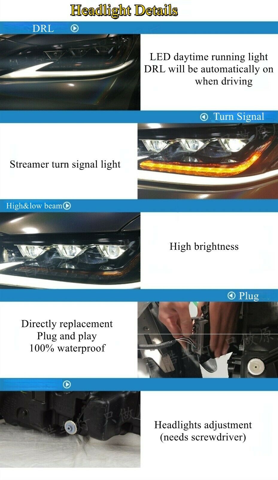 The package includes 1 pair of NEW (made in China) / original used (with new lens and cover, if needs 100% original, please leave a message.) triple beam LED headlights to fit LEFT-HAND DRIVE cars! Contact us if you have any questions. Thanks.